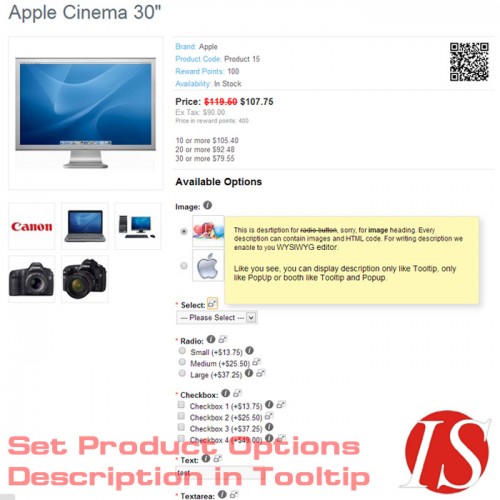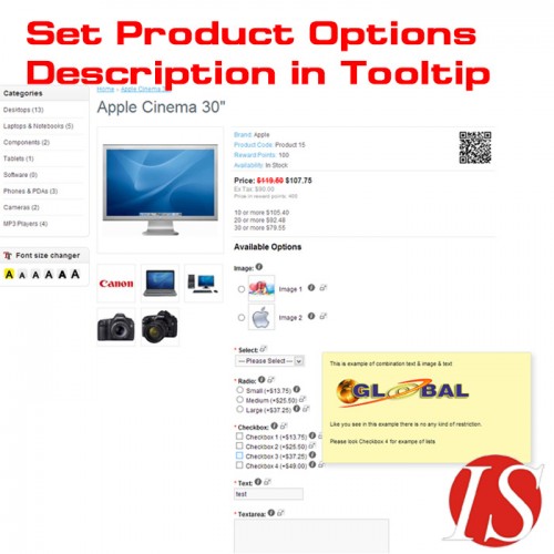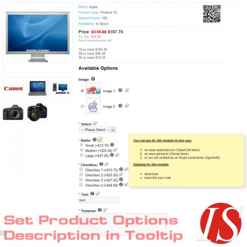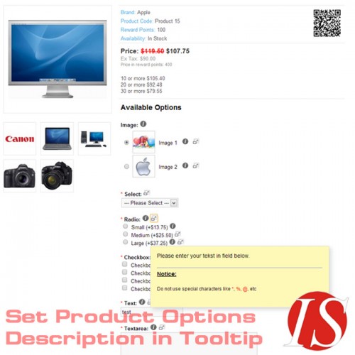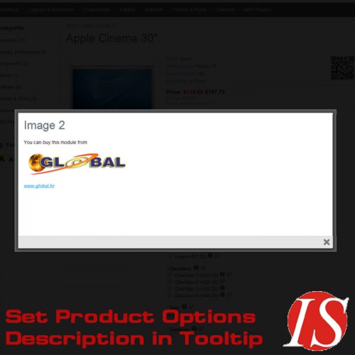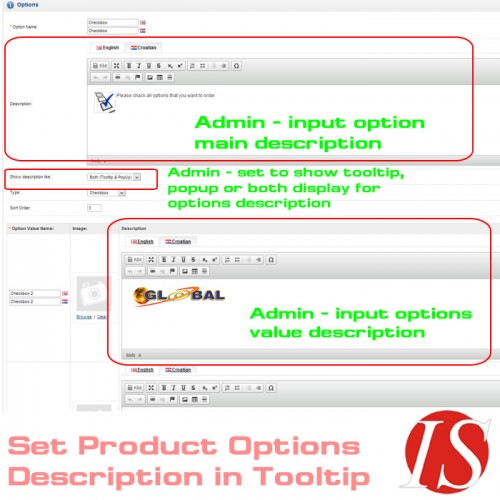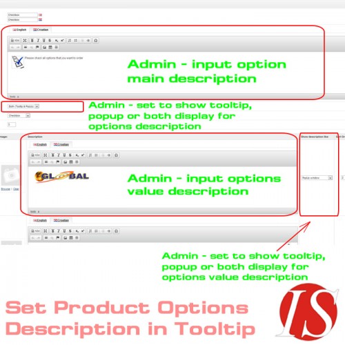 Ovaj modul omogućuje dodavanje opisa (s HTML sadržajem za sve instalirane jezike - multijezično) u vrijednosti opcija artikala za radio button, checkbox i slike, i opisa  (s HTML sadržajem) u sve nazive opcija. Na stranicama kataloga moguće je pikazati opise kao tooltip prozor (s HTML sadržajem na svim instaliranim jezicima - multijezično) prelaskom miša preko ikoneuz opciju, ili kao popup prozor (colorbox) kliknuvši na ikonu, ili na oba načina (prikažu se 2 ikone). U administratorskom dijelu možete definirati kako želite da se prikazuju opisi u katalogu (kao tooltip, kao popup, ili oboje).